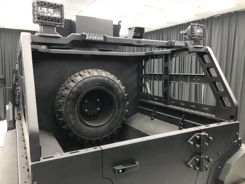 A mine protected truck variant of our innovative BATT APC, this urban and off-road platform adds blast protection into its V-shaped underbody and heavily protected crew seating to its compartment. With a blast protection of up to STANAG 4569 Level II a and b, the BATT UMG incorporates high blast protection in the small APC sized class. A custom in-house axle design allows for an extra 6,000 lbs of payload capacity which means our BATT can handle the weight of the added armoring requirement.